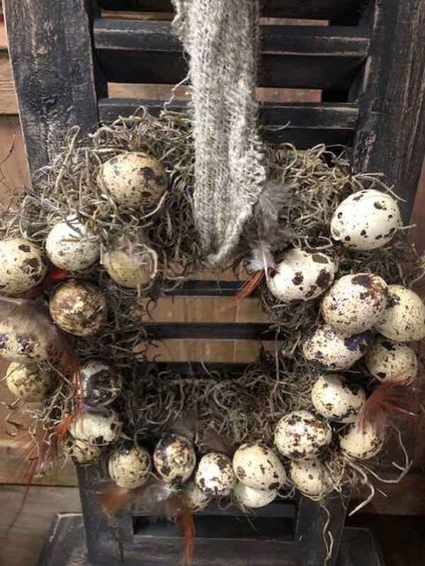 Houten louvreluikje met tilandsia kransje met kwarteleitjes.