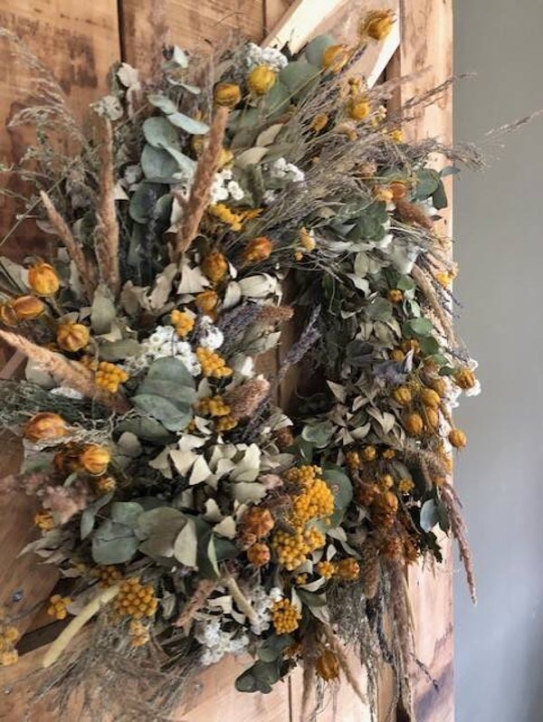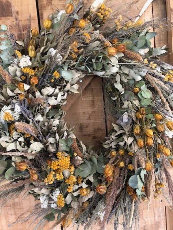 Droogbloemen krans met gedroogde bloemen van de zonnebloem, mini papaver, steeneik, eucalyptus, lavendel en edelweiss.