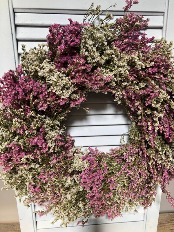 Krans van gedroogde limonium op een oud wit louvreluik.
