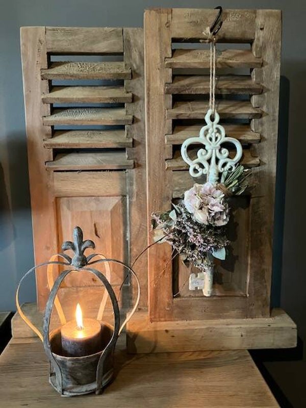 Decoratie sleutel met toefje van eucalyptus,statice en hortensia.