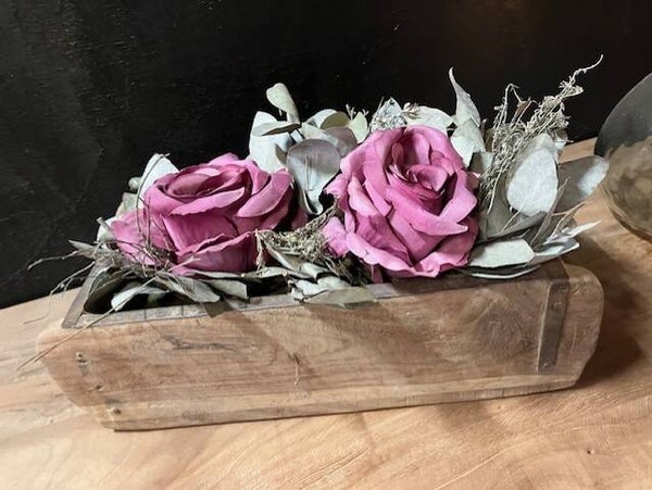 Houten steenmal met mooi bloemstuk van gedroogde materialen en zijden rozen erin.
