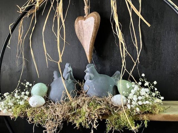 Grote ringkrans van 70 cm doorsnee met stenen kippetjes op plankje en houten hartje erin gemaakt.