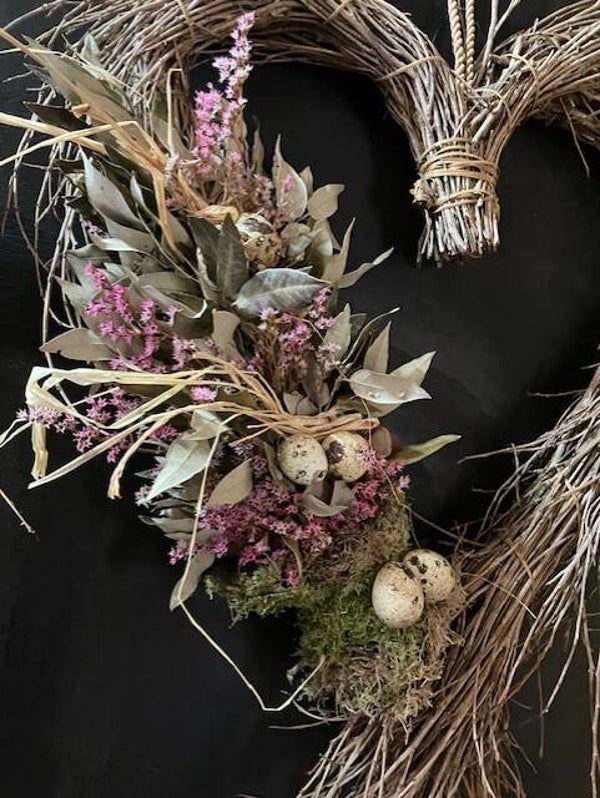 Super mooi hart van takjes met bloemstuk erop gemaakt van steeneik, kwarteleitjes en roze droogbloemen.